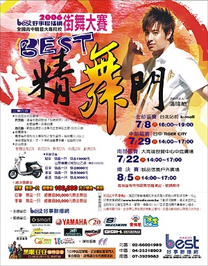 ![]() 自7月8日起至8月5日止,台灣戴姆勒克萊斯勒旗下smart品牌將於北中南三大都會區,贊助好事聯播網舉辦「Best精舞門全省巡迴街舞大賽」,屆時不但有精采萬分的街舞比賽、蒞臨現場還能與知名的hip hop歌手MC Hot Dog、潘瑋柏、楊培安、Hip Hop Honey、大支一起 High翻天;同時,smart車款更在現場繽紛展示,為活動增添熱情奔放氣息;8月5日決賽當天,除邀請到DJ-E Turn帶來熱力十足的演出,當天smart fortwo平面廣告塗鴉創作高手Reach Lee,也將應邀於現場即興塗鴉,歡迎所有喜愛smart及Hip Hop精神的朋友們一同Fun暑假。
