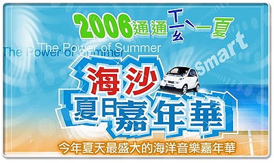 ![]() 除陳昇、新寶島康樂隊等重量級歌手及樂團在沙灘音樂舞台Live演出外,現場還有全國第一屆沙灘躲避球大賽、親子水舞台區海洋婚紗秀、趣味競賽;活動舞台區的tattoo彩繪秀、造型變裝秀、肚皮舞表演;以及七大海洋生態展覽館等規劃,內容豐富,絕對是今夏最IN的選擇。同時,經台灣戴姆勒克萊斯勒與許多smart的熱心車主們大聲號召,現場將會同時展示60部以上造型可愛、色彩鮮明的smart車款,為夏日嘉年華注入最繽紛的色彩。