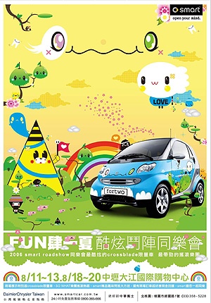 smart同樂會來囉!8月11日起至9月3日止,連續4個週末假日於全省北中南各地展開「smart Fun肆一夏 酷炫鬥陣同樂會」巡迴車展,smart車迷無論在台灣頭台灣尾都能與smart走到哪,玩到哪!