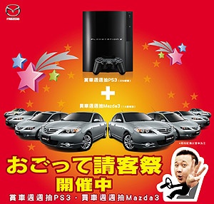 ![]() MAZDA Taiwan執行長劉宗信表示,MAZDA秉持日式人文精緻精神所推出的產品一向受到廣大消費者的歡迎,因此MAZDA Taiwan為了回饋消費者的熱情愛戴,特別舉辦MAZDA「おごって請客祭」回饋活動。即日起至明年的2月7日,消費者只要到MAZDA展示間賞車,就有機會抽中目前市面上最炙手可熱的遊戲主機PS3,連抽8週,週週送10台;而在活動期間訂購MAZDA任一車種並交車者,還可以再抽Mazda3 1.6房車,連抽8週,共送出8輛。