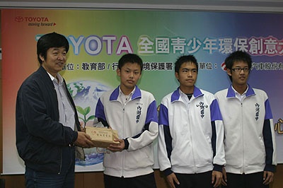 ![]() ▲新竹內湖國中獲得國中組特優獎-頒獎人顧洋先生「TOYOTA全國青少年環保創意大賽」,係針對全國國中及高中青少年舉辦之環保團體創意大賽,參賽隊伍須師生共同參與,自今年十月起至十一月底止,總計吸引全國國、高中約600組參賽。27日決賽作品即由其中選出,入圍作品國中組及高中組各16件。12月27日當天將自兩組入圍作品中各選出佳作3組優選2組及特優1組,分別給予獎學金及獎狀。評選委員則由陳曼麗女士、王珮蓮女士、潘娉玉女士及顧洋先生等環保/教育/美學學者及專家共同組成。國中組及高中組的特優作品分別為新竹內湖國中的「青菜滴家啦(台語)」及彰化員林農工的「鋁行天下」。