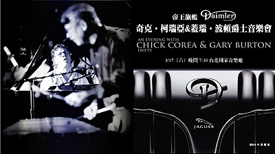 Daimler為英國人心目中難以忘懷的無上品牌,尊貴與豪華仍不足以形容它的地位,無數次成為皇室御用座駕,讓Daimler散發出皇者風範,正由於其形象尊貴,Daimler更傳承英國豪華房車的光榮歷史,擔負起挑戰頂級豪華房車市場之大任,相信只有冠上Daimler的飾徽,方能顯示其輝煌地位,就如同皇冠上閃閃動人的鑽石般;而奇克、柯瑞亞&蓋瑞、波頓的二重演奏,讓人感受到當鋼琴與迴音琴相互組合,就美如鑽石燦如繁星的點點音符迴盪散落,已榮獲12次葛萊美大獎的爵士大師奇克、柯瑞亞,擁有令人望塵莫及的榮耀,並不斷嘗試融合新的音樂元素,創造許多爵士史上經典名曲;2007年3月17日,JAGUAR帝王旗艦Daimler 與兩位大師將攜手為35年合作成就喝采,JAGUAR帝王旗艦Daimler 奇克、柯瑞亞&蓋瑞、波頓爵士音樂會,JAGUAR帝王旗艦Daimler皇室御車,配上爵士萬花筒般驚喜期待,將使台北夜空無限閃耀。