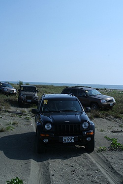 第一天的行程中,Jeep Club在台南近郊綿延長達2.5公里的沙灘作為沙地越野體驗的地點。出發前,由熟捻越野活動的台灣克萊斯勒台南經銷商吳清和總經理,向所有參與會員介紹沙地越野的技巧及注意事項。事實上,Jeep Club的會員在參加過多次聚會後,都有著一定的越野操加經驗,因此大夥兒在經過基本整裝後,便在前導車帶領下循序前進,在體驗過程中,所有會員除了學習到在軟質沙地上的行駛技巧,對於路線的選擇也有更深入之了解,即使不幸身陷沙中,大家也會發揮互助精神利用絞盤脫困,而這也是為何從事相關越野活動時,皆必須團體行動的原因,因為不僅可以互相照應,也可藉此交換心得,達到聚會的目的。