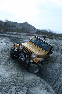 相較於第一天的沙灘地形體驗,第二天的行程可說是難得的新奇越野路線。這天,Jeep Club首次來到位於台南縣與高雄縣交界、著名的「月世界」,獨特的泥岩地形,光禿的灰白色地表,宛如月球表面般,且鬆軟的泥岩增加了行駛路線的不確定性,讓這天越野難度提高不少,不過,也讓大家有機會體驗類似在月球表面開車的特殊感受。