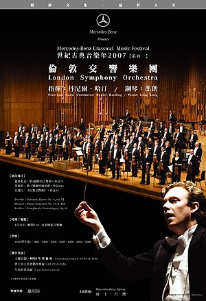 Mercedes-Benz世紀古典音樂年2007系列一倫敦交響樂團(London Symphony Orchestra,LSO),即將於4月29日假台北國家音樂廳磅礡登場!由首席客席指揮丹尼爾•哈汀領銜指揮,首度訪台即以一百三十人的浩大陣容結合知名鋼琴家郎朗共同演出,為台灣的觀眾帶來2007最撼動人心的交響盛宴!