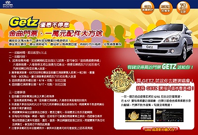 即日起止5月底,只要於現代汽車官方網站(www.nanyang.com.tw)預約並完成GETZ試乘,即可參加金曲獎頒獎典禮入場券抽獎,本月GETZ交車即贈送金曲慶功演唱會雙人套票(一組2張),數量有限只有90組幸運兒可以擁有,送完為止。頒獎典禮入場券得主名單將6月6日於現代汽車官方網站公佈,頒獎典禮與演唱會入場券將於六月初由專人送達。現代GETZ要給你一場獨一無二的音樂饗宴。