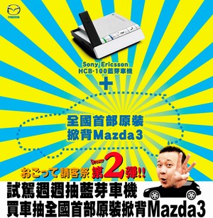 大家最熟悉的おごって(O-Go-Tte)即將再現江湖!在今年初掀起一陣「O-Go-Tte」炫風的MAZDA請客祭活動,將要由「MAZDAおごって請客祭 第2彈」來接棒!從5月19日起到6月30日止,連續六週讓你享受MAZDA最有禮的請客祭活動!來試車週週即抽100台Sony Ericsson HCB-100藍芽車機,購買MAZDA旗下任一車款則有機會入主最具個性的Mazda3 Sport掀背鋼砲,讓你成為全台第一位搶先擁有的車主!