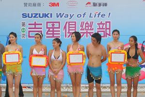 和清涼的辣妹fun暑假!![]() ▲月眉的招牌節目當然就是大海嘯!這種場面還真是名符其實的「人山人海」!玩水豈能沒有泳裝辣妹?活動當日SUZUKI特地邀請六位泳裝美少女前來與所有SUZUKI汽車愛用者同樂,一起進行「翹臀阿GOGO」與「妹力四射」活動,現場活動只見所有參與活動的SUZUKI汽車愛用者們莫不使出渾身解數,也造成相當的高潮,尤其在「翹臀阿GOGO」遊戲中,所有SUZUKI汽車愛用者們反應出奇熱烈,參與活動的車主扭腰擺臀的努力想把裙上的乒乓球搖下來,大家努力的模樣,甚至連在場的主持人與六位泳裝美少女們都自嘆弗如,而台下所有的SUZUKI汽車愛用者們也都融入活動中,加油聲此起彼落,現場氣氛熱鬧萬分。而在另一個遊戲「妹力四射」活動中,呼應「清涼fun暑假」的活動主題,SUZUKI也準備了水槍邀請台下的SUZUKI汽車愛用者們上來與六位泳裝美少女對戰,戰況緊張刺激,現場驚呼聲不斷,當然而參與此次活動的SUZUKI汽車愛用者們,也都有精美的贈品可拿。