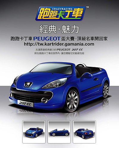 在2007年底上市並旋起猛爆上空風潮的 PEUGEOT 207CC 車款,在短短不到 2 個月的時間就已接單達 25 輛以上。PEUGEOT 國內總代理 寶嘉聯合為讓更多的消費者能近距離的享受 PEUGEOT 207CC 優雅的上空風情,特別與目前會員數達 360 萬的知名線上遊戲-『跑跑卡丁車』進行異業結盟,將 PEUGEOT 207CC 化身為遊戲中的主角之一,並將舉辦「跑跑卡丁車PEUGEOT盃大賽」,玩家將有機會贏得冠軍獎項-免費駕馭PEUGEOT 207六個月。