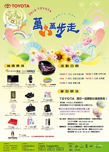 「2010 TOYOTA萬人萬步走」活動自9月13日起開始報名,報名費200元。報名者可獲得Toyota健走帽乙頂以及健走手冊乙本,還有機會抽中TOYOTA Yaris 1.5E汽車及其它多項大獎,總獎值高達五百萬元。今年五場巡迴全台之時間地點分別為:10月23日(六)台北大佳河濱公園、10月30日(六)桃園石門水庫、11月6日(六)彰化田尾公路花園、11月13日(六)台南走馬瀨農場,以及11月20日(六)高雄都會公園,民眾可依地域或方便性擇區報名。個人報名者,請至Toyota全台營業據點當場繳交報名費,同時領取報名禮。10人(含)以上團體報名者,請洽報名專線 (02)6636-9568 (02)6636-9568 萬小姐,並將報名表傳真至 (02)8773-1969 (02)8773-1969 ,以郵局劃撥匯款後去電確認,始完成報名手續。