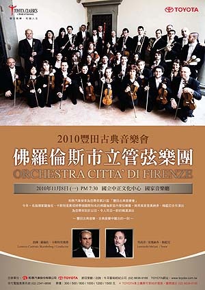 由豐田汽車及其台灣總代理和泰汽車公司共同舉辦之「豐田古典音樂會」,今年將邀請享譽歐洲的義大利佛羅倫斯市立管弦樂團(ORCHESTRA CITTÀ DI FIRENZE),於11月8日假國家音樂廳盛大演出。