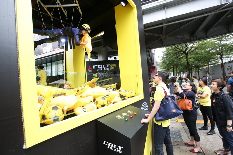 大膽採用黃黑跳色時尚設計,全新上市的 MITSUBISHI COLT PLUS【炫風黃】限定版,以驚人的58.9萬超值價,炫亮登場!MITSUBISHI特地選在台北的時尚中心-信義區,尋找一群跟COLT PLUS炫風黃一樣充滿時尚又熱愛運動的朋友,組隊來挑戰全國首創6M高的超大娃娃機。