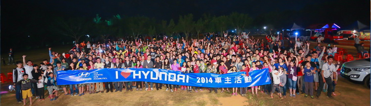 在「I LOVE HYUNDAI 」的年度活動主軸下,2014年HYUNDAI汽車大型車主活動11/8-11/9正式於中部「天馬生態園區」熱鬧展開,進行兩天一夜的大型露營活動,而參與此次活動的HYUNDAI車主總計近200台車輛、1,000人一同共襄盛舉。