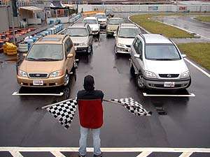 此次汽車購買指南特地租借Gallop小型車賽車場來測試這八款轎式休旅車,車型包括FORD MAV、MAZDA Premacy、OPEL Zafira、KIA Joice、KIA Carens、DAEWOO Tacuma、CHRYSLER PT cruiser、PROTON Samcoma,都是入門級的轎式前輪驅動休旅車。雖然當天飄著小雨,工作進度受到影響,且一次要評比八部車,任務相當艱鉅,要整合眾編輯之意見下個結論更是煞費苦心。