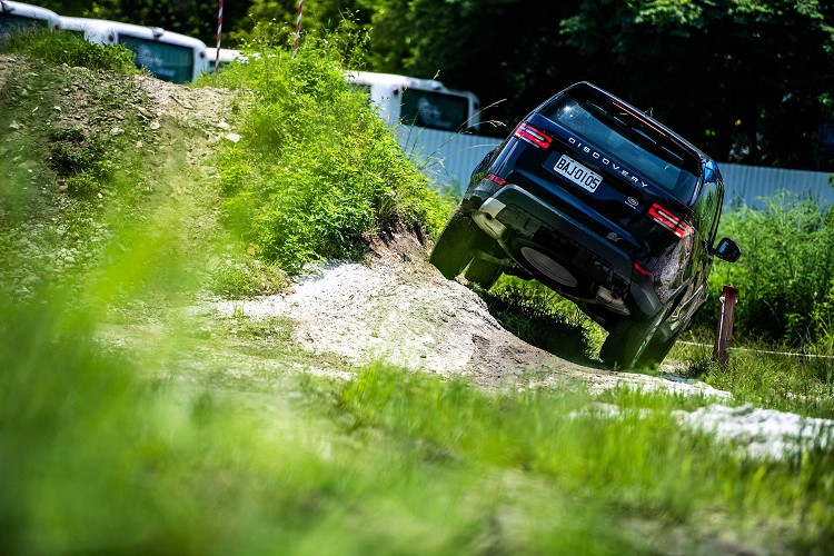 2. 50度側傾坡:Land Rover 單體式車體採用輕量化高強度鋁合金或鋼材,強度高且重量輕,車身剛性及整體配重佳。部份車款採用雙A臂懸吊結構,有助於越野時產生最佳輪胎貼地性;而氣壓懸吊具車身水平調整功能,有效吸收部份車身傾斜角度,能輕鬆駕馭大角度側傾地形。