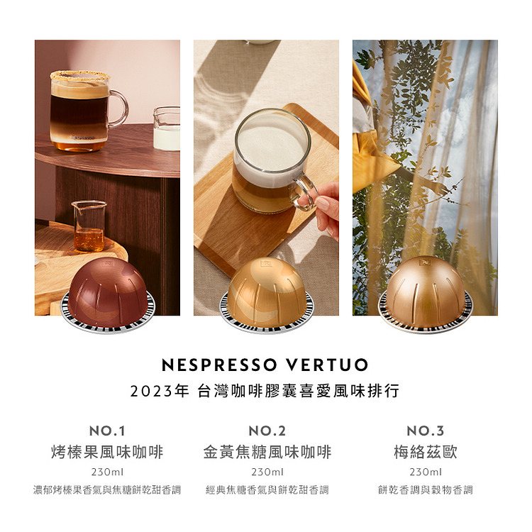 而台灣人則偏好富含風味的甜香咖啡,Nespresso Vertuo咖啡特調大師系列更深受消費者喜愛,在此次排行中就囊括兩款,包含烤榛果風味咖啡、金黃焦糖風味咖啡,皆能加入牛奶或不同食材來製作成拿鐵、專屬特調,滿足台灣人對咖啡的百種想像!