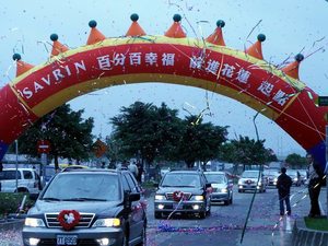 由花蓮縣政府舉辦的全國集團婚禮,3月29日在花蓮市海洋公園隆重舉行。由中華汽車所提供100輛的Mitsubishi SAVRIN,將在婚禮中組成迎親車隊,將準新郎新娘們由花蓮遠來飯店迎接至典禮會場,在大喜之日感受幸福的氣息。這場集團結婚除了花蓮縣長張福興、中華汽車總經理蘇慶陽為100對新人見證婚禮外,另一個令人注目的焦點就是,這也是台灣史上最壯觀的禮車- SAVRIN幸福結婚車隊,從昨天早上,由台北出發,北中南三地匯集100輛SAVRIN幸福結婚禮車,前往花蓮,為100對新人帶來百分百的幸福。