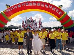 即將於10月17日假台北舉辦的「2004中華汽車國際馬拉松」目前正如火如荼地熱烈報名中。繼7月份馬拉松傳令兵、中華汽車兄弟象企業日等一波波造勢活動後,為鼓勵更多民眾可以接觸健康路跑,主辦單位中華汽車特別於8月7日(六)上午號召身穿情侶裝的情侶、精心打扮的愛犬與主人、祖孫三代、各行各業代表、公司及經銷體系員工,逾600人,至盃賽起跑地-中正紀念堂舉行馬拉松試跑活動;甫獲世界超馬冠軍的台灣之光林義傑也以馬拉松大使的身分到現場為這些參與試跑的熱情民眾加油打氣,現場的熱鬧氣氛讓人感受到「全民都在為馬拉松準備」的活力。