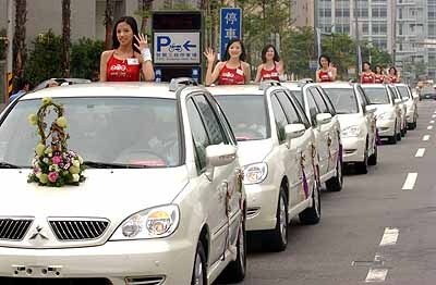 ![]() 9/2中午由中華三菱PAJERO為前導車的30輛New SAVRIN Elite 車隊,載著30位進入決賽的模特兒們由喜來登飯店出發,途經忠孝東路進入比賽會場TAIPEI 101,每位身穿紅色背心的模特兒們各自乘坐一輛屬於自己的幸福心房車New SAVRIN,不時開心地自天窗向外與民眾揮手致意,個個看起來信心十足、神采奕奕;再輔以中華三菱特別精心為Elite 車隊New SAVRIN所規劃設計的粉紅色系芭比娃娃花綵與粉紫色車身緞帶的雅緻裝飾,使得這一支充滿時尚魅力的模特車隊一路聲勢浩大地開往比賽會場,表現出這群年輕亮麗的台灣model們不容忽視的氣勢。