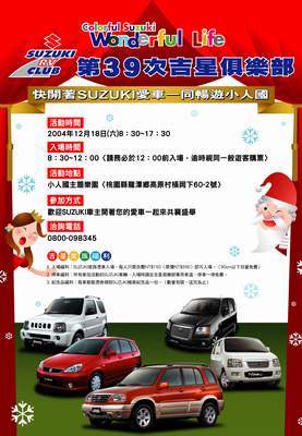 2004年最炫的SUZUKI年度盛會『吉星俱樂部』又將舉辦囉!在眾多車友的熱烈回應下,相信上一次歡樂美好的回憶一定是環繞心頭久久不散!所以,本次SUZUKI特地挑選在充滿世界風情及越野冒險的小人國主題樂園,時間就訂在12月18日(六),心動不如馬上行動,趕快開著SUZUKI愛車,帶著一顆輕鬆的心,與全家人一同暢遊小人國主題樂園囉!
