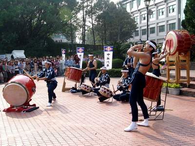 ![]() 鬼太鼓座成員們一到中華汽車楊梅廠時,先是以竹苗、三味線、尺八、箏等日本傳統樂器彈奏輕鬆、詼諧的日本民謠熱鬧進場,而同仁托兒所的小朋友們也敲打著手中的鈴鼓、木魚、響板等各式樂器來歡迎這些遠道而來的貴客;期待已久的上百位中華汽車同仁與楊梅地區民眾更是紛紛簇擁上前迎接;中華汽車的代表也特別致贈馬拉松專刊給予這些正在挑戰環台馬拉松的鬼太鼓座成員們,讓成員們了解中華汽車連續三年分別在太魯閣、曾文水庫以及台北舉辦馬拉松活動所展現寶島的活力與美麗風光,同時傳達出中華汽車與鬼太鼓同樣追求超越自我、挑戰極限的精神。隨後,鬼太鼓座成員們即在廠區內展開台灣首場的祈福表演,讓在場的民眾無不感受到鬼太鼓座所呈現出地動山搖、氣吞天下的震撼力。