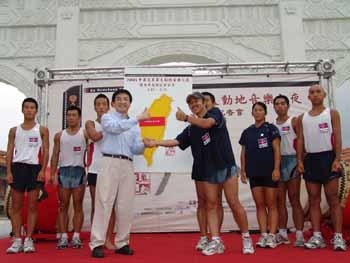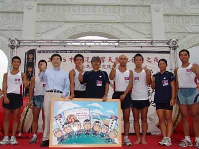 國際知名藝術團體鬼太鼓座於4/8~6/13期間來台進行【2005中華汽車響天動地音樂之夜-環台馬拉松巡迴公演】,所有成員自4/13起跑,以一個半月的時間,每天30公里的路程,進行全程近1,200公里的環台馬拉松,並於5/31(二)下午抵達終點台北中正紀念堂,完成台灣首次外籍人士環台馬拉松的壯舉!