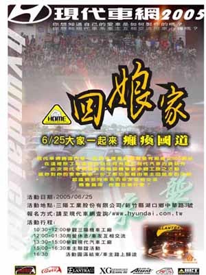 ![]() 2005年南陽實業為持續讓現代車主了解與體驗現代汽車的製造品質與生產規模,並學習安全駕駛觀念的附加駕駛樂趣,再次於6月25日舉辦車主回娘家活動;同時也讓現代車主在週休假期獲得現代汽車真正的關懷與全新的感受。