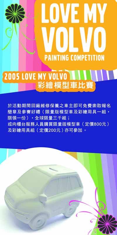 2005 Love My Volvo 彩繪模型車賽 報名方式 活動對象:VOLVO車主之子女或近親皆可參加 活動期間:9月1日起至10月31日止 收件時間:9月15日起至11月15日止 活動方式: 1、活動期間回廠維修保養之車主即可免費索取報名簡章及參賽好禮---限量版模型車及彩繪用具一組,全球限量三千組。 2、或向櫃台服務人員購買限量版模型車及彩繪用具亦可參加。 比賽分組: 兒童組 7~9歲 小大人組 10~12歲 青少年組 13~15歲 活動相關訊息請洽: 免付費客服專線:0800-40-60-80 活動小組聯絡人: 02-33221133分機303 李小姐 台灣富豪汽車全省授權維修中心