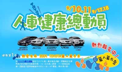 多走路多健康喔!踏出你的健康第一步,就來參加『熱愛生命2005 TOYOTA萬人萬步走』健走活動,大步邁向健康新生活,只要來TOYOTA營業所與和運租車營業據點報名,就可獲得健走專用活力計步器與元氣健走帽,10/1淡水漁人碼頭、11/5高雄澄清湖活動當天還有機會抽中WISH一台及多項大獎喔!