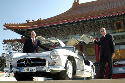 ▲(左)戴姆勒克萊斯勒大中華區總裁兼執行長費若銘(右)台灣戴姆勒克萊斯勒總裁葛福睿與永恆的經典300SL合照本次台灣戴姆勒克萊斯勒在中國風濃郁的中正紀念堂舉辦新車發表會,透過東方與西方元素之結合,將當代汽車工藝極品淋漓盡致呈現。在這場別開生面的品牌盛會中,展示Mercedes-Benz不同車款共13輛,包括開創嶄新級距、追求時尚的B-Class運動跑旅;豪邁霸氣與優雅氣質兼具的新一代M-Class豪華休旅;以及引領時代、追求極致的全新S-Class典範旗艦。這三款新車無論是顛覆汽車空間,扭力與輸出的大幅躍進,並創造動感駕駛樂趣,在在彰顯Mercedes-Benz致力追求創新的理念。