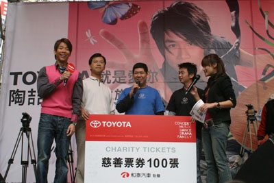 ![]() 為提升年輕族群對TOYOTA品牌的認同與喜好,特別邀請相當受到年輕族群歡迎的陶喆,到剛落成的台北小巨蛋舉辦演唱會。這是和泰汽車公司首度舉辦流行音樂演唱會,希望能藉由這樣的活動與目前的年輕族群有更多互動與了解,讓年輕消費者感受TOYOTA的熱情與活力。而在陶喆的演唱會中,和泰汽車也將邀請100位喜憨兒小朋友與大家一起感受年輕族群的活力與熱情。