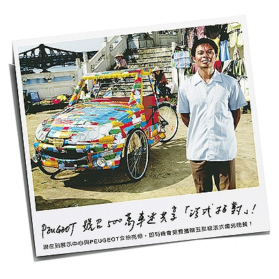 PEUGEOT Fans 召集令,即日起至2月底止,所有PEUGEOT的迷戀者,不論崇拜程度的高低,只要至全省 PEUGEOT展示中心,與心目中的夢想車款合照參加抽獎;亦或是上網進行網路票選活動者,就有機會獲得台北喜來登大飯店法式燭光晚餐或PEUGEOT精美贈品。活動期間內訂車之新車主,還可參加台北喜來登大飯店五星級住宿券含法式燭光晚餐抽獎活動。