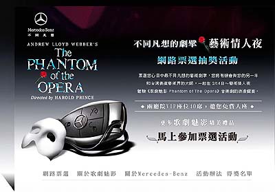 台灣戴姆勒克萊斯勒旗下品牌Mercedes-Benz此次的歌劇魅影贊助活動,已創下國內有史以來演出時間最長的音樂表演活動記錄。為了答謝國內民眾的支持,Mercedes-Benz進一步舉辦及贊助「不同凡想的巨擘—藝術情人夜」網路票選活動,除了鼓勵民眾增加對於國內藝術家的認識及支持,並希望能有更多民眾可以體驗難得的國際藝術饗宴,擁有不同的欣賞視野。