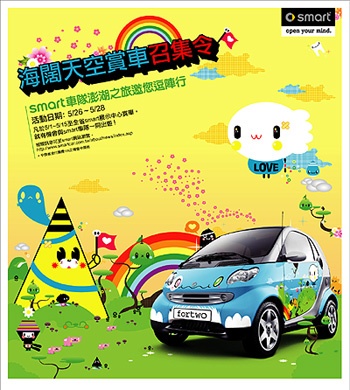 smart專玩有趣的活動!smart 車主的足跡已踏遍全台南北,今年初夏,smart club再次出擊,發出海闊天空賞車召集令,要smart車主趕快加入club,與大家逗陣行!這次即將前往澎湖的club會員活動具有多項創舉,包括首度特別企劃長達三天兩夜的活動、首次讓smart品牌最強悍車種─forfour BRABUS在離島亮相、並率先邀請車主參加澎湖年度盛事「澎湖海上花火節」、在離島星空下觀賞難得一見的高空煙火秀!