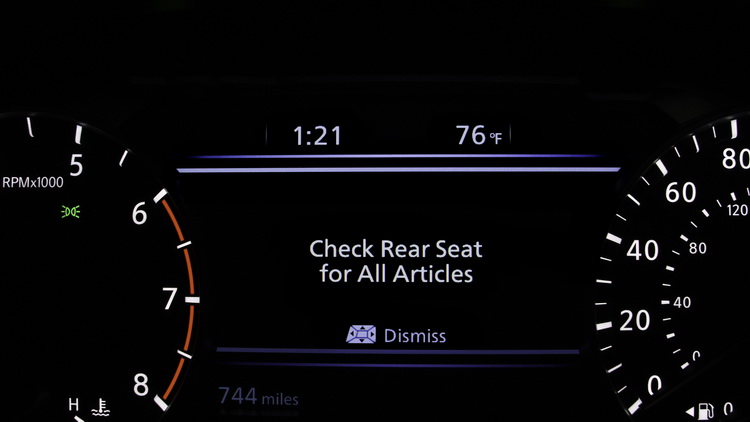 目前在2018年式的NISSAN Pathfinder上就配備RDA系統,當後車門在車輛行駛之前與之後有開啟和關閉的動作的話,系統就會開始進行一連串的提醒動作,首先會在儀錶的行車資訊顯示幕上顯示訊息,如果駕駛者還是沒注意就熄火、離開車子、鎖門的話,系統就會再發出喇叭聲來進一步提醒。對於不少有習慣性健忘的車主來說,是相當貼心的功能(當然,你也可以暫時或永久性關閉此功能)。