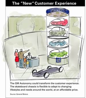 GM AUTOnomy帶來的震撼涵蓋了整個產業,不僅從汽車的設計方式、零組件產業結構甚至銷售的方法,都將有深刻改變。未來消費者買車時只要選擇底盤之上具有不同造型與功能的車殼,汽車公司將幫你「套」在底盤上,交車到你手上,所以,千萬不要小看你兒子玩的軌道賽車,未來你的座駕也將是同樣概念!