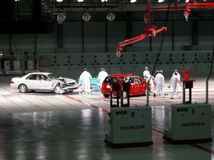 全球最完善的撞擊測試場![]() ▲HONDA獨創的多功能撞擊測試場,可進行各種角度的撞擊測試,規模與設備皆為世界之冠。被動安全部分,HONDA建立了全球第一所多重角度、可以實車互撞的大型室內撞擊測試中心,以模擬各種可能在道路上發生的車禍。在這個測試場中,不但可以進行車子撞向固定牆壁的傳統測試標準,更可以模擬不同車重等級的兩車對撞實驗,如用最大的HONDA Legend與小車子Fit對撞,然後進行損壞分析,以改良車身的結構。