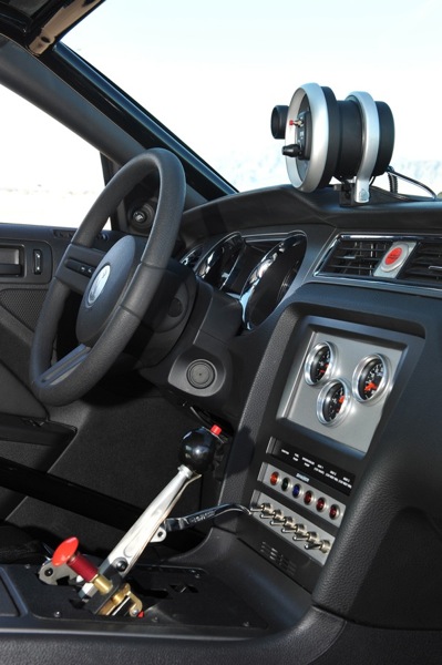 ![]() 看看那誇張的前後輪配製,就知道這部 Cobra Jet Mustang是衝著直線加速賽而來。這部名符其實的賽車,具備了賽事專用的變速系統,無論是自排或是手排,任君挑選;避震系統當然也是為了因應直線賽道而做的調教;為了避免翻車時賽車手受傷,全車的防滾籠當然也是必備;更重要的是裝置在行李箱的防爆油箱,全都是為了瞬間的直線加速快感。為了安全,車手可以事先預設引擎轉速,當即將起步時,只需要用力採下油門,拉起手煞車,即可進行後輪暖胎,不用擔心引擎過熱而發生危險。這樣的裝置先前也同樣於改裝市場發表。