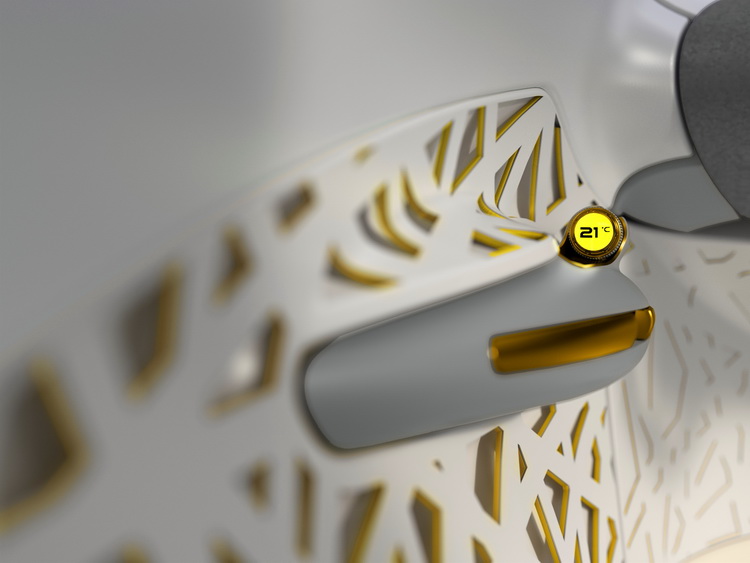 ![]() 至於內裝部分,則導入了「繭」的元素來營造舒適的居住感,設計上也自鳥巢汲取靈感。座椅給人輕盈明亮的感覺。另一個特別的地方則是駕駛座椅背後方的後座空調控制與出風口以同心圓方式整合在一起。「中控台」其實就是一台平板電腦,用來操作與導航控制「 Flying Companion」。