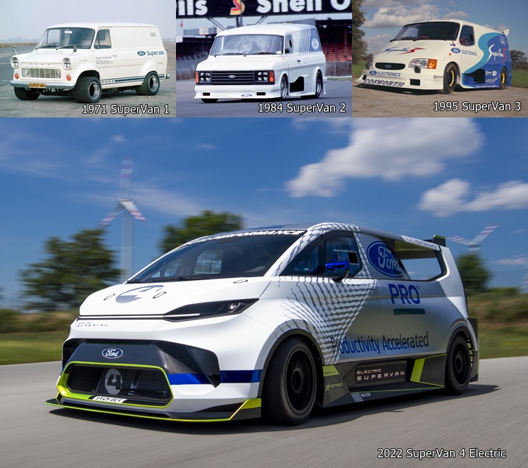 Ford在英國Goodwood速度嘉年華中公開最新一代的純電廂型概念車Pro Electric SuperVan,以水冷50 kW鋰電池配合自行研發的控制系統,四組馬達共可輸出最大2000ps的超強馬力,只需2秒即可完成0-100km/h加速過程。