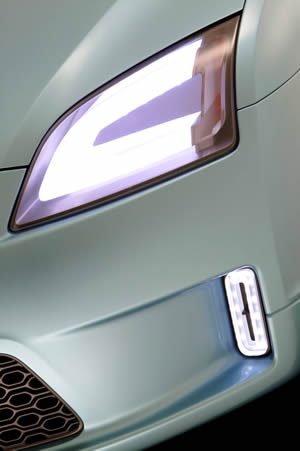 ![]() ▲大膽採用白光LED做為頭燈與霧燈,是Focus Concept的獨創的嶄新概念。然而概念車畢竟是概念車,儘管保持了Focus車系簡潔飽滿的鮮明線條,這部概念車上展示了前所未見的創新特色∼前後車燈。福特汽車與Osram Opto半導體公司合作開發,大膽採用了前後LED照明技術,LED使用在後尾燈組已經越來越普遍,然而頭燈使用高亮度白色LED,以特殊光學設計形成連續而呈現長條狀發光的機構,將之繞行於燈殼內側產生獨特且高亮度的冷光效果,形狀與車體相互呼應,而霧燈也採用同樣的方式,以長方形環狀發光體鑲嵌於保險桿兩側。尾燈組也應用相同技術呈現三角形的均勻白色冷光,看來LED在車燈上的應用將有重大的突破。