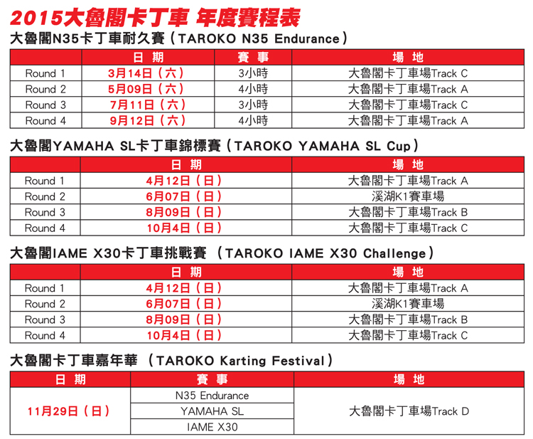 大魯閣N35卡丁車耐久賽![]() 2015年首場賽事將於3月14日卡丁3耐揭開序幕,其後分別於5/9、7/11、9/12登場,全年度共規劃四站賽程,決賽時間分為3小時或4小時,賽道包括大魯閣卡丁車場標準700m Track A和Track C(後減速彎)等,視賽站不同有所調整,增加挑戰難度與趣味性。由於「大魯閣N35卡丁車耐久賽」非CTMSA中華賽車會認證賽事,因此只要是具備賽車熱情的玩家都可以報名,費用分別是每隊12,000元(4小時)及9,000元(3小時),車手需合作組隊參賽輪流駕駛,享受比賽緊張氣氛與耐久賽的終極挑戰。