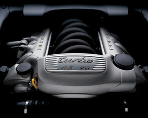 有別於現行911與Boxster車系都是使用水平對臥式的動力系統,Cayenne搭載了一具水冷設計、排氣量4.5升的DOHC V8引擎,其中Cayenne S所搭載的自然進氣版本擁有340hp/6000rpm的最大馬力與42.8kgm/2500-5500rpm的最大扭力,而Cayenne Turbo則是在追加了一套雙渦輪增壓、附中繼冷卻器(Intercooler)的強制進氣裝置之後,將動力一舉提升到450hp/6000rpm的水準,最大扭力也一同晉升到63.2kgm/2250-4750rpm的程度。在Cayenne上,PORSCHE提供了新開發的六速Tiptronic S手動模式自排變速系統作為選用,在這套變速系統的配合下,S車款能夠在7.2秒內由靜止加速到100km/h,並且達到242km/h的極速,至於標準配備Tiptronic S(美規車款)的Turbo則擁有5.6秒的0-100km/h加速能力,極速則高達266km/h,考量到SUV車種遠較跑車高出許多的正向投影面積所造成的高風阻,這樣的性能表現已是不負PORSCHE的威名了!