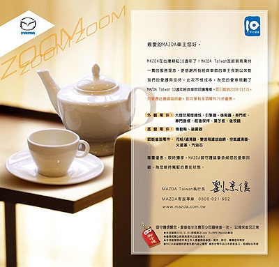 MAZDA Taiwan自1998年10月成立以來,已累積了17萬輛的銷售佳績,為感謝車主們對MAZDA Taiwan長期的支持與肯定,在成立十週年的榮耀時刻,MAZDA Taiwan特別推出「經典車款感恩節」活動,針對車齡滿五年以上的MAZDA Capella、MPV、Mazda6等經典車款的車主們,提供多項外觀、底盤及節能省油零件更換的優惠折扣,凡即日起至2009年1月16日至全省MAZDA經銷商預約更換零件,就享有零件75折的優惠。
