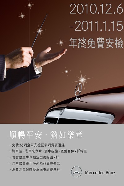 歲末將至,台灣賓士全台授權服務廠推出年終免費安檢。活動自即日起至2011年1月15日止,提供車主優質、且安全無虞的駕乘感受;除享指定零件與專屬精品優惠,車主憑邀請函回廠更可獲得「新年禮讚」音樂贈禮。誠摯地邀請Mercedes-Benz及smart車主為愛車預約此全方位的車況檢查服務。