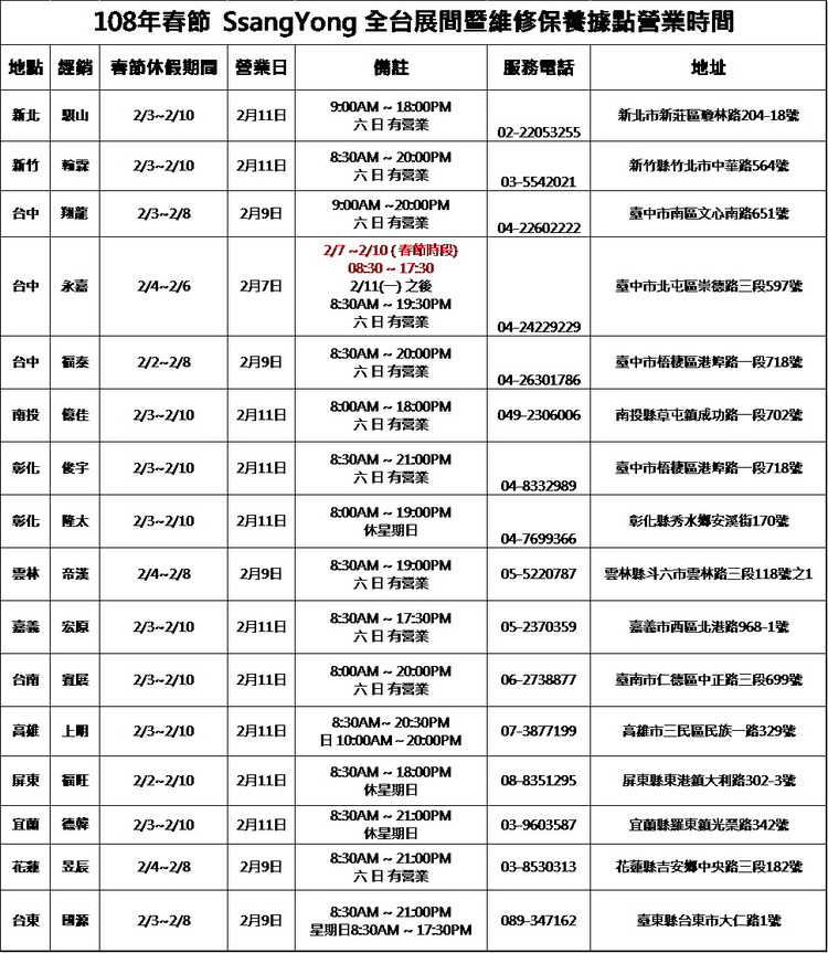農曆春節假期即將展開,年節用車需求頻次增加,尤其長途返鄉團圓更為重要年節計畫行程,除建議消費者於除夕年前為愛車進行周全的車況檢測之外,SsangYong 總代理-永嘉雙龍汽車為因應春節期間車況突發狀況之維修服務處理,更貼心成立「春節期間服務聯絡網」,即時替車主解決車輛問題。
