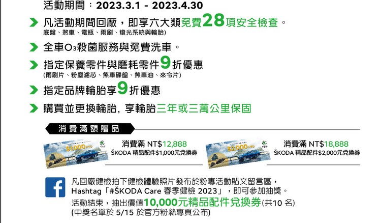 ŠKODA Care系列的2023年春季健檢正式啟動,自3月1日起至4月30日為期兩個月,本次「FUN心春遊」活動提供六大類28項免費安全檢查,只要回廠參加活動,不僅可享有指定保養零件優惠,亦有機會抽中價值新台幣10,000元的ŠKODA精品配件兌換券 (共10個名額)