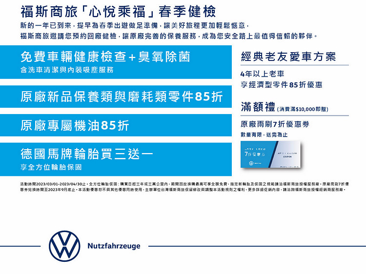 備註: 1. 全方位輪胎保固:購買日起三年或三萬公里保固,期間內因故換購最高可享全額免費。 2. 福斯商旅原廠雨刷7折優惠券,限兌換時間至2023年9月30日止。 3. 本活動優惠恕不與其他優惠同時使用,主辦單位台灣福斯商旅保留修改與調整本活動規則之權利。