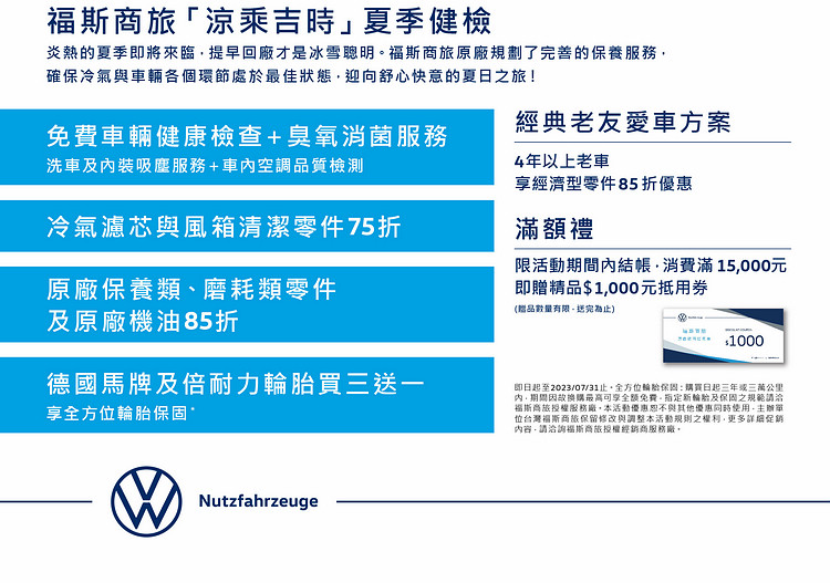 ![]() 福斯商旅「涼乘吉時」夏季健檢活動優惠內容,包括:(1)免費車輛檢查+車艙臭氧消菌服務+洗車及內裝吸塵與車內空調品質檢測、(2)冷氣濾芯與風箱清潔零件75折、(3)原廠保養類、磨耗類零件及原廠機油85折、(4)德國馬牌及倍耐力輪胎買三送一,享全方位輪胎保固等回饋,以高規格的原廠守護,許一個美麗夏日。