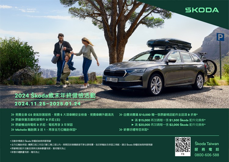 Škoda自2024年11月25日起至2025年01月24日止推出 Škoda歲末年終健檢活動,不僅提供免費5大項車輛安全檢查,指定零件、機油、電瓶、輪胎更享有多種優惠。讓 Škoda 車主在這靜謐的季節裡也可感受到 Škoda 卓越的售後服務,除了提供原廠專業保養服務,我們秉持「Human Touch」的理念,為您帶來貼心且以顧客為本的服務體驗,更提供多種車主專屬優惠活動來呵護您的愛車。